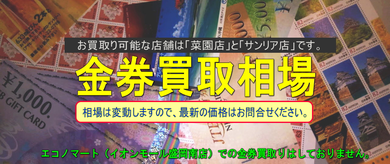 - エコノマート菜園店とサンリア店での金券買取価格です。こちらの価格表が最新価格ですが、急激な相場の変動があった場合などは予告なく価格を変更する場合があります。