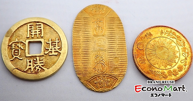 金製|万延小判|金製古銭|3点をお買取させていただきました。今回は古銭のお買取りです。古銭のお買取りはしていますが、金製、銀製の物に限ってのお買取りになります。万延小判は金含有率が約57%でK14相当でのお買取りになります。他の古銭も同じぐらいの含有率になりました。小判にも種類があるので、お持ちの方は一度ご相談ください。今回は高価買取になりました。買取単価は岩手県内でもトップクラスで、大手貴金属会社と同じ金額で買取をしております。買取単価は日々変動いたしますので、いつでもお問合せしてください。貴金属相場が上昇中ですので、お持ちの金、プラチナ製品ありましたら一度ご相談ください。当店は手数料など一切かかりませんので、査定金額はそのままお客様にお支払いします。金、プラチナの買取金額を知りたい方はホームページをチェックしてください。エコノマートでは、金、銀、プラチナ素材のメダル各種の査定、買取を毎日行っております。金種や素材が不明なお品物もお持ちいただけましたらしっかりお調べして、査定額を提示致します。日本の製品に限らず海外の金貨、メダルなども査定可能です。査定後は一度お持ち帰りになり、ご検討頂いても結構ですし、ご納得いただけましたらそのまま買取りも可能です。貴金属、地金類の査定・買取りなら20年以上の実績と経験のエコノマートにお任せください。