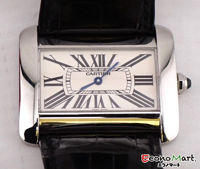 こんにちは、エコノマートです。Cartier|カルティエ|タンクディヴァンLM|W6300655|クォーツをお買取りさせて頂きました。フランス語で「長椅子」を意味するディヴァン。その名の通り横長のケースを採用しています。革ベルトもケースにあわせて幅が広く、バングルのようにおしゃれに装着ができます。今回は状態が良く、高価買取となりました。今お持ちのカルティエがいくらになるか知っておいても損はないはずです。当店でもこれまで多くのカルティエを査定・お買取りさせていただきました。お手持ちのカルティエ各種の時計がございましたらお気軽に当店の無料査定をご利用ください。箱、ギャランティ等、付属欠品でも大歓迎です。動かなくなった物や動作不良品も査定が可能ですのでお気軽にお持ちください。エコノマートは電池切れや、不動、動作不良、壊れた時計なども買取り実績があります。「もう使わない」、「使えなくなった」という場合は是非お持ちください。