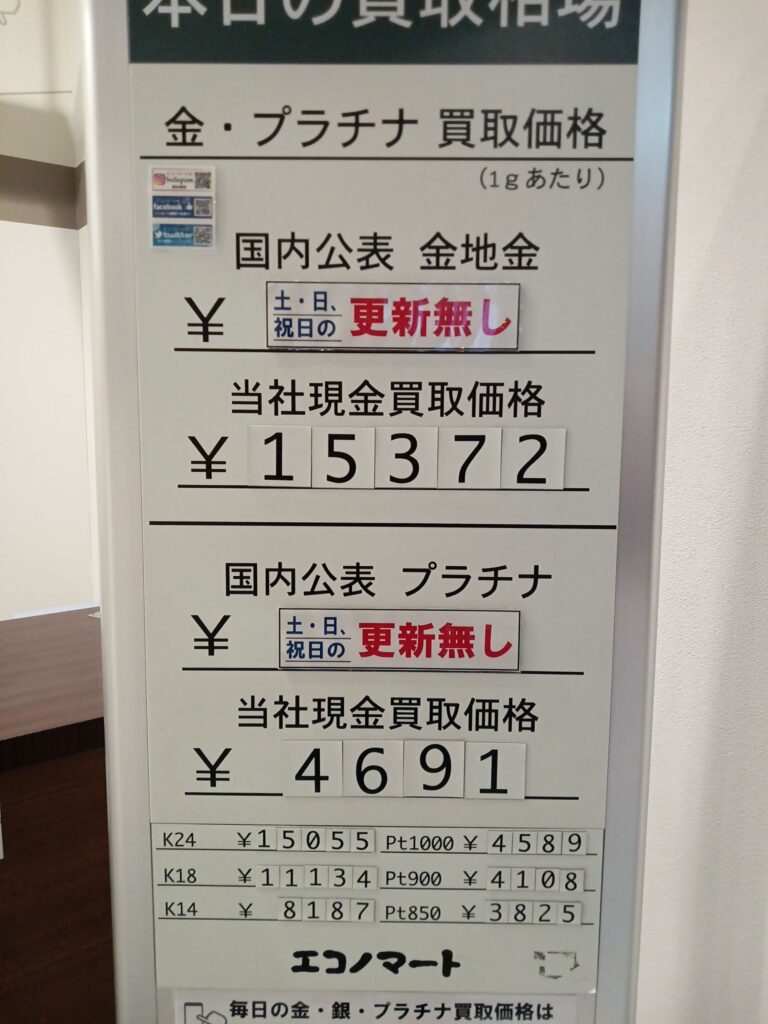 3/23(日)本日の金・プラチナ買取価格《エコノマート 盛岡南イオン・アネックスカワトク・サンリア》