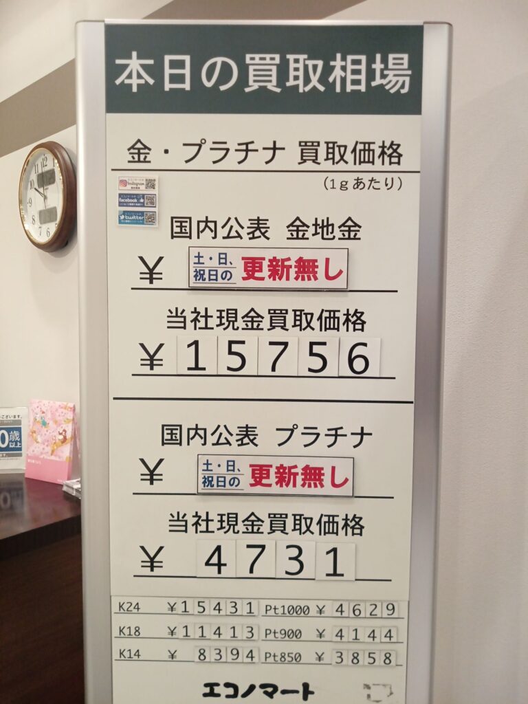 3/30(日)本日の金・プラチナ買取価格《エコノマート 盛岡南イオン・アネックスカワトク・サンリア》