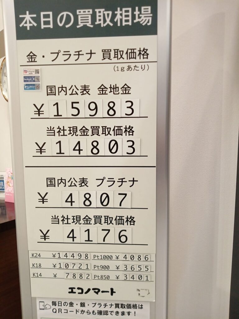 エコノマートは本日も金・銀・プラチナ製品各種を岩手県内トップクラスの買取単価にお買取りしております。
