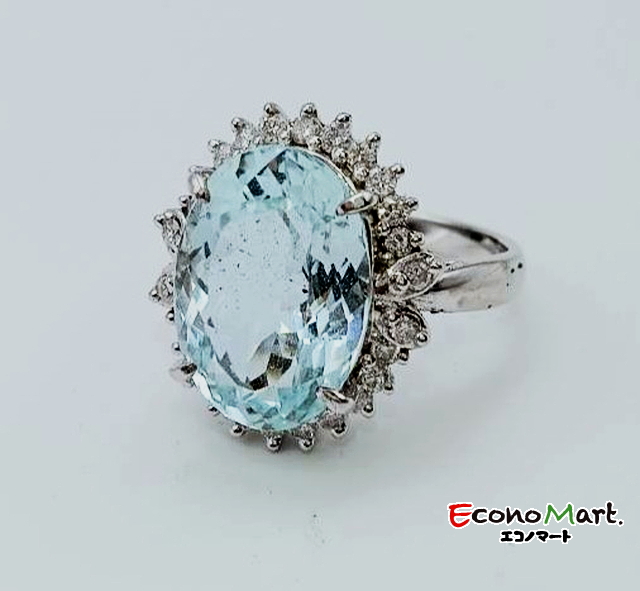 プラチナ素材のリング、大きいアクアマリンとダイヤを使用をし、豪華さを演出しています。金相場が高騰して注目が集まっていますが、プラチナ素材のお買取りもしています。買取金額は金には及びませんがお持ちの方はご相談ください。