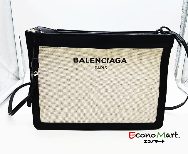 バレンシアガ、ネイビーポシェットはキャンバス生地でサイズが小さく、マチが薄目でおしゃれなバッグです。状態良く、高価買取になりました。