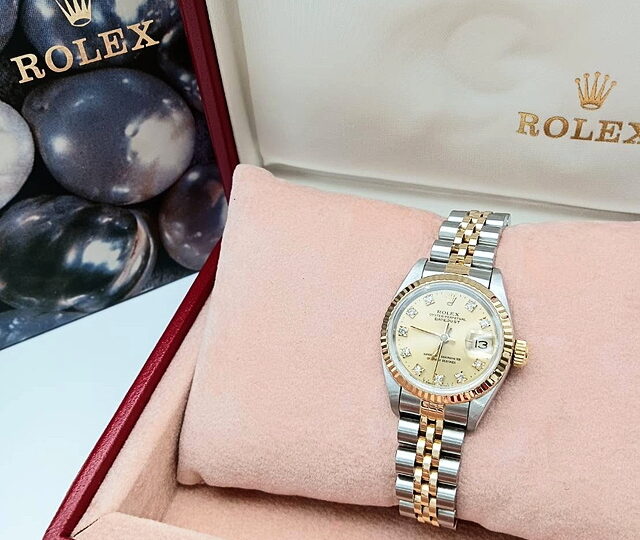 ロレックス、レディースタイプのデイトジャスト。K18、ステンレスのコンビモデル。シンプルなデザインの中に高級感溢れる時計になっております。