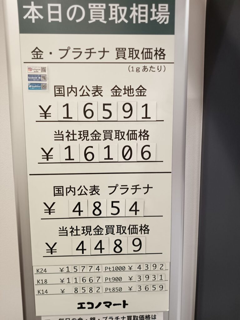 エコノマートは本日も金・銀・プラチナ製品各種を岩手県内トップクラスの買取単価にお買取りしております。