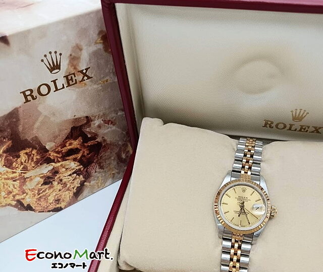 ロレックス、レディースサイズのデイトジャストのお買取りです。K18を使用し高級感溢れる腕時計になっています。今回は状態良く、高額買取になりました。
