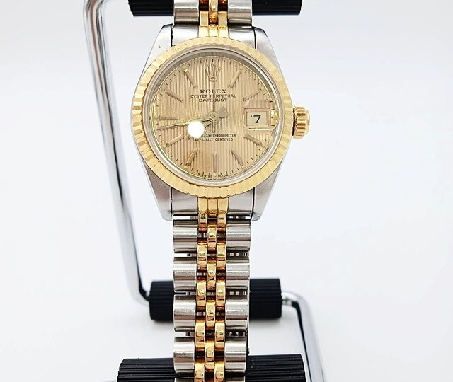 ロレックス、デイトジャストのお買取りです。文字盤で印象がガラッと変わるロレックス。今回は縦じま模様のタペストリー文字盤です。コンビモデルで高級感が増して見えます。今回は状態良く高価買取になりました。