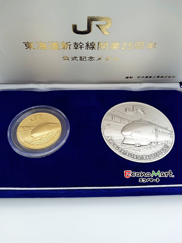K24、SV1000、メダルのお買取りです。東海道新幹線開業25年を記念して作成されたメダル。金と銀の二枚セットになります。重量はK24のメダルは25g、SV1000は100gでした。今回は2枚合計で400,000円を超える査定金額になりました。