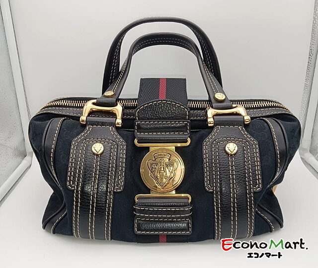 グッチ、ハンドバッグのお買取りです。正面のグッチの丸いプレートが目に付くハンドバッグ、ヒステリア。デザイン、装飾などインパクトがあるバッグです。今回は状態良く、高価買取になりました。