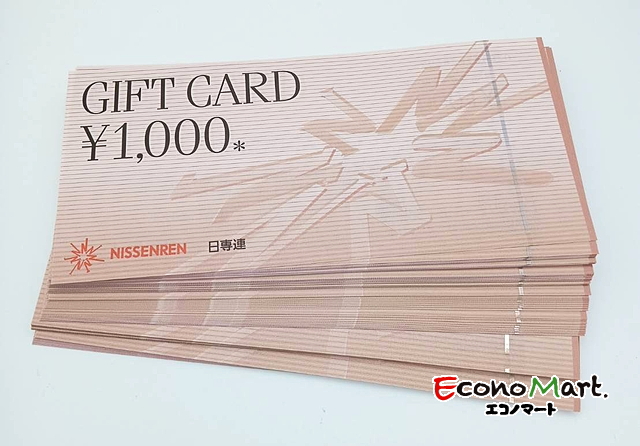 金券のお買取りです。日専連ギフトカードの1000円券のお買取りです。額面により85~90%のお買取りで、使用期限が1年以上に限ります。金券、商品券のお買取りは9月1日オープンの盛岡菜園店、大船渡サンリア店になります。販売は致しておりませんのご注意ください。 ※イオンモール盛岡南店ではお買取りはしておりません。