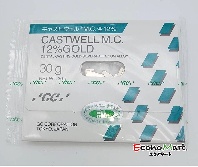 キャストウェル 12%金パラ歯科材 30gのお買取りです。歯科鋳造用の金銀パラジウム合金です。熱処理によって硬さ、弾性、靭性を発揮し、様々な歯科用金属の鋳造に用いられる材料です。