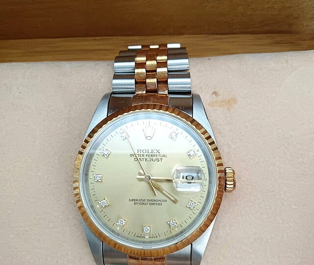 ロレックス、腕時計のお買取りです。K18イエローゴールドとステンレススチールのコンビのデイトジャスト。インデックスにダイヤを使用して高級感あふれる時計になっております。1990年代より人気のあり、今現在でも愛用者が多いモデルです。今回は状態良く、高額買取になりました。